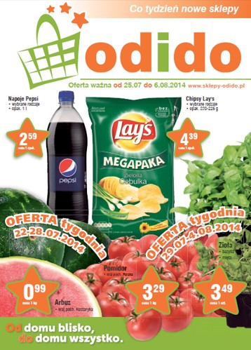 Nowa gazetka promocyjna sklepów Odido. Polecane promocje z gazetki Odido: Pepsi 1 L - 2,59 zł. Chipsy Lay's 220 g - 4,39 zł. Arbuz 1 kg - 0,99 zł. Oferta ważna od 25.07 do 6.08.