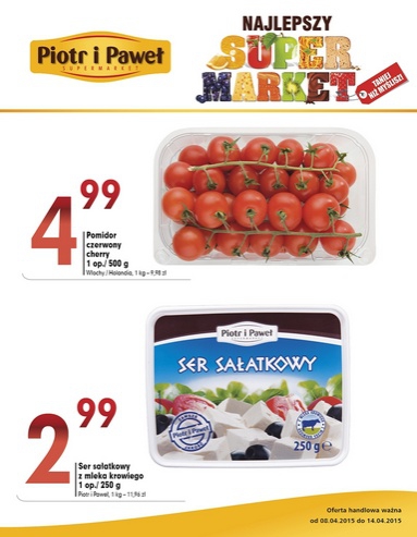 Nowa gazetka promocyjna sieci sklepów Piotr i Paweł. Polecane promocje z gazetki Piotr i Paweł: Pomidory czerwone cherry 500 g - 4,99 zł. Ser sałatkowy z mleka krowiego 250 g - 2,99 zł. Arbuz czerwony 1 kg -…