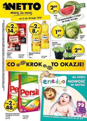{loadposition linkNetto} Nowa gazetka promocyjna Netto - "Co krok to okazje!". Polecane promocje z gazetki Netto: Olej słonecznikowy Ollineo 2x1 L - 8 zł. Arbuz 1 kg - 2,89 zł. Proszek do prania Persil 2x3,75 kg - 48…