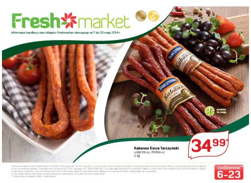 {loadposition linkFreshmarket} Nowa gazetka promocyjna Freshmarket. Polecane promocje z gazetki Freshmarket: Kabanosy Extra Tarczyński 1 kg - 34,99 zł. Ogórki małosolne wiaderko 900 ml - 8,99 zł. Arbuz 1 kg - 4,99 zł. Oferta ważna od 7.05 do…