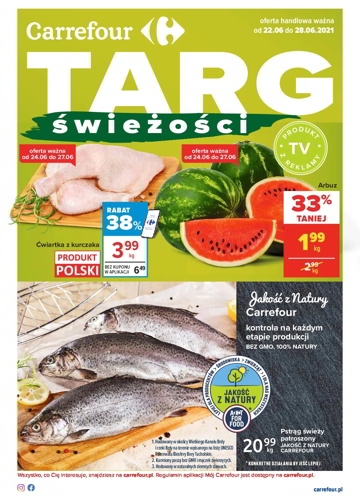 {loadposition linkCarrefour3} 'Targ świeżości' - nowa gazetka promocyjna sieci marketów Carrefour. Polecane promocje z gazetki Carrefour: Ćwiartka z kurczaka 1 kg - 39,99 zł*. Arbuz 1 kg - 1,99 zł**. Pstrąg świeży patroszony Jakość Z Natury Carrefour - 20,99…