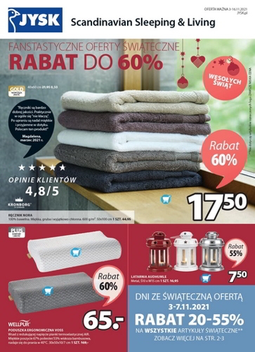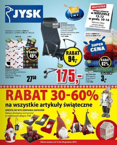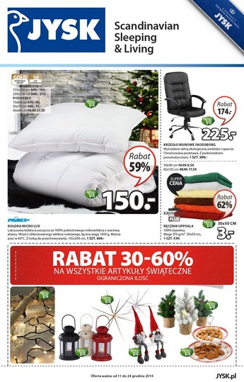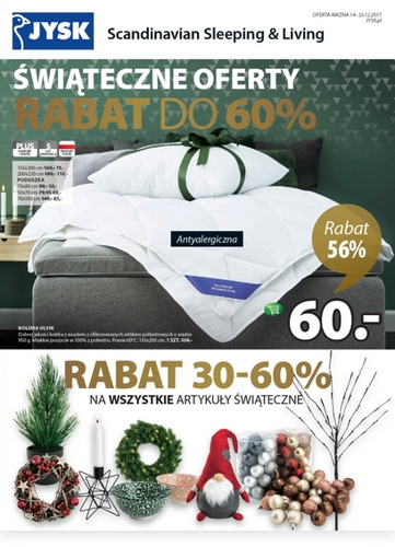 'Świetne oferty świąteczne' - nowa gazetka promocyjna sieci sklepów JYSK. Polecane promocje z gazetki Jysk: Rabat 30-60% na wszystkie artykuły świąteczne. Rabat 20-50% na wszystkie komplety pościeli. Rabat 30-49% na wybrane ręczniki. * - rabat…