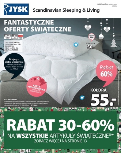 'Fantastyczne oferty świąteczne' - nowa gazetka promocyjna sieci sklepów JYSK. Polecane promocje z gazetki Jysk: Rabat 30-60% na wszystkie artykuły świąteczne. Rabat 20-60% na wszystkie kołdry i poduszki. Rabat 20-49% na wybrane komplety pościeli dziecięcej. Oferta ważna…