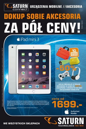 {loadposition linkMediaMarkt} Nowa gazetka promocyjna Saturn - "Dokup sobie akcesoria zz pół ceny!". Polecane promocje z gazetki Saturn: Tablet APPLE iPad mini 3 16GB Wi-Fi - 1699 zł. Notebook ASUS F555LD-XO489H - 1999 zł. Notebook LENOVO Z50-70 59-441362 -…
