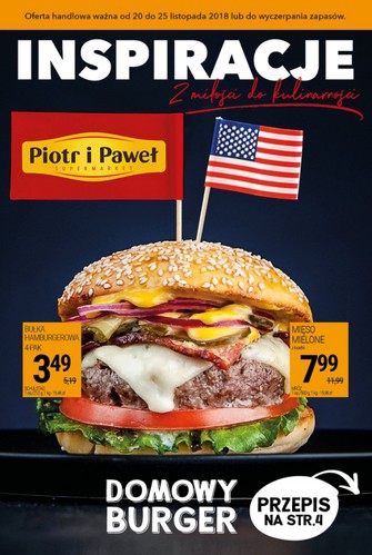 'Inspiracje z miłości do kulinarności' - nowa gazetka promocyjna sieci sklepów Piotr i Paweł. Polecane promocje z gazetki Piotr i Paweł: Bułka hamburgerowa 4-pak - 3,49 zł. Mięso mielone z łopatki Mróz 500 g - 7,99 zł. Awokado Hass…