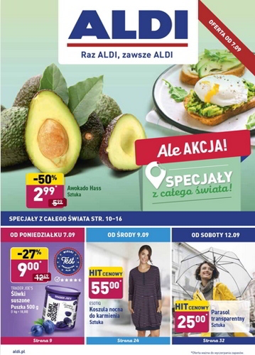 {loadposition linkAldi} 'Ale akcja! Specjały z całego świata!' - nowa gazetka promocyjna sieci sklepów Aldi. Polecane promocje z gazetki Aldi: Awokado Hass 1 sztuka - 2,99 zł. Koszula nocna do karmienia Esotiq - 55 zł. Parasol transparentny - 25…