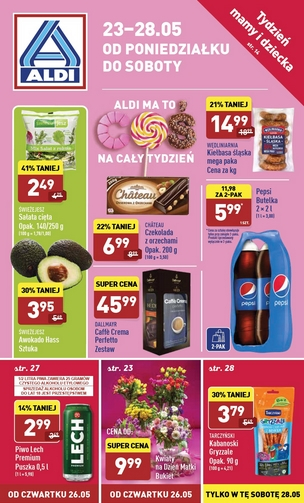 {loadposition linkAldi} 'Aldi ma to coś na cały tydzień' - nowa gazetka promocyjna sieci sklepów Aldi. Polecane promocje z gazetki Aldi: Kiełbasa śląska mega paka Wędliniarnia 1 kg - 14,99 zł. Pepsi 2x2 L - 11,98 zł. Awokado Hass…