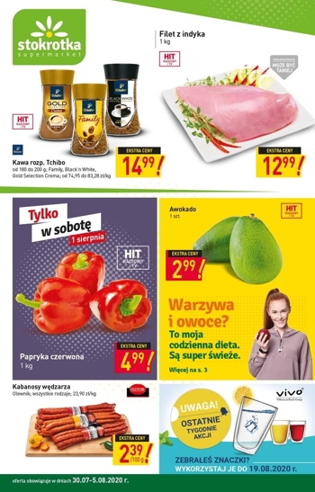 Nowa gazetka promocyjna sieci sklepów Stokrotka. Polecane promocje z gazetki Stokrotka: Kawa rozpuszczalna Tchibo 200 g - 14,99 zł. Filet z indyka 1 kg - 12,99 zł. Awokado 1 sztuka - 2,99 zł. Oferta…