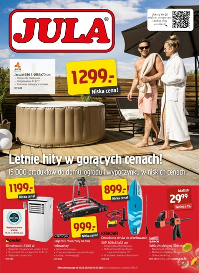 'Ciesz się pełnią lata z naszymi produktami! 15 000 produktów do domu, ogrodu i wypoczynku w niskich cenach' - nowa gazetka promocyjna sieci handlowej Jula. Polecane promocje z gazetki Jula: Bagażnik rowerowy na hak holowniczy Hamron - 999 zł.…