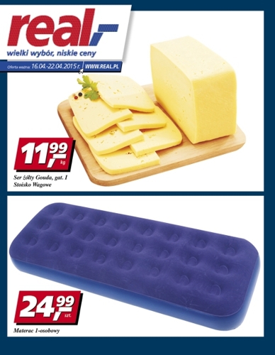 Nowa gazetka promocyjna sieci handlowej Real. Polecane promocje z gazetki Real: Ser żółty Gouda 1 kg - 11,99 zł. Materac 1-osobowy - 24,99 zł. Bagietka z serem - 0,99 zł. Oferta ważna od 16.04 do 22.04.