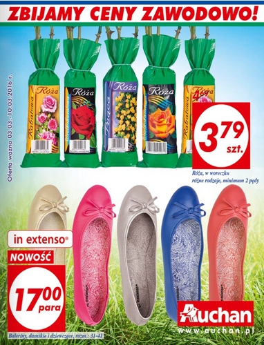 {loadposition linkAuchan} Nowa gazetka promocyjna Auchan. Polecane promocje z gazetki Auchan: Róża w woreczku różne rodzaje - 3,79 zł. Baleriny damskie i dziewczęce - 17 zł. Półbuty męskie - 40 zł. Oferta ważna od 3.03 do 10.03.