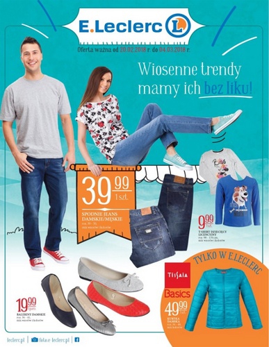 {loadposition linkEleclerc} 'Wiosenne trendy - mamy ich bez liku' - nowa gazetka promocyjna sieci handlowej E.Leclerc. Polecane promocje z gazetki E.Leclerc: Spodnie jeans damskie lub męskie - 39,99 zł. Balerny damskie - 19,99 zł. Kurtka damska…