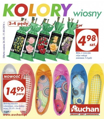 {loadposition linkAuchan} Nowa gazetka promocyjna Auchan - "Kolory wiosny". Polecane promocje z gazetki Auchan: Róża w woreczku min. 3-4 pędy - 4,98 zł. Baleriny damskie - 14,99 zł. Kalosze dziecięce - 24,99 zł. Oferta ważna od 26.02 do…