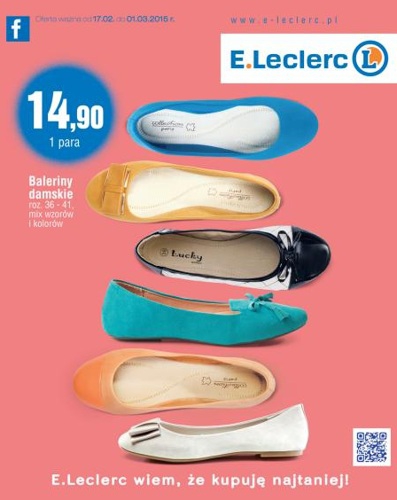 {loadposition linkEleclerc} Nowa gazetka promocyjna sieci handlowej E.Leclerc. Polecane promocje z gazetki E.Leclerc: Baleriny damskie - 14,90 zł. Szalik damski - 9,99 zł. Bluzka damska - 14,90 zł. Oferta ważna od 17.02 do 1.03 lub do wyczerpania zapasów.
