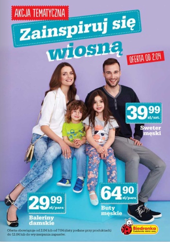 {loadposition linkBiedronka} Nowa gazetka promocyjna sieci handlowej Biedronka - "Zainspiruj się wiosną". Polecane promocje z gazetki sieci Biedronka: Sweter męski - 39,99 zł. Baleriny damskie - 29,99 zł. Buty męskie - 64,90 zł. Oferta ważna od 30.03 do…