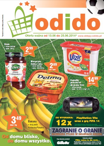 Nowa gazetka promocyjna sklepów Odido. Polecane promocje z gazetki Odido: Dżem Łowicz 280 g g - 2,99 zł. Kapsułki do prania Vizir 15 sztuk - 14,99 zł. Banany 1 kg - 3,49 zł. Oferta ważna od 13.06…