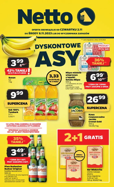 {loadposition linkNetto} 'Dyskontowe asy' - nowa gazetka promocyjna sieci sklepów Netto. Polecane promocje z gazetki Netto: Banany 1 kg - 3,99 zł*. Mięso mielone wieprzowe z łopatki Sztuka Mięsa Netto 500 g - 6,99 zł**. Sok Tymbark 3x1 L…