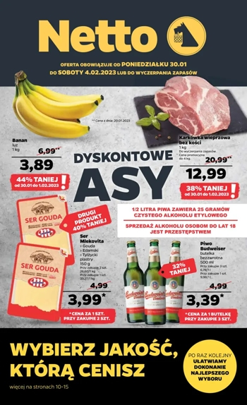 {loadposition linkNetto3} 'Dyskontowe asy' - nowa gazetka promocyjna sieci sklepów Netto. Polecane promocje z gazetki Netto: Banany 1 kg - 3,89 zł*. Karkówka wieprzowa bez kości 1 kg - 12,99 zł**. Piwo Budweiser 500 ml - 3,39 zł***. …