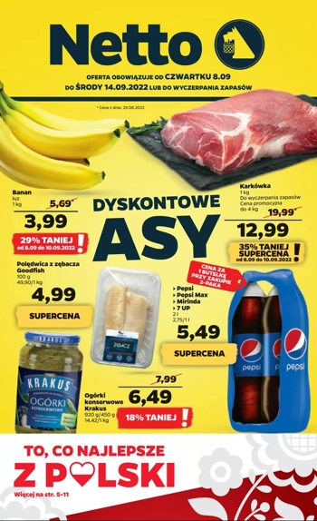 {loadposition linkNetto} 'Dyskontowe asy' - nowa gazetka promocyjna sieci sklepów Netto. Polecane promocje z gazetki Netto: Banany 1 kg - 3,99 zł*. Karkówka 1 kg - 12,99 zł*. Polędwica z zębacza Goodfish 100 g - 4,99 zł. *…