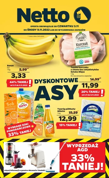 {loadposition linkNetto3} 'Dyskontowe asy' - nowa gazetka promocyjna sieci sklepów Netto. Polecane promocje z gazetki Netto: Banany 1 kg - 3,33 zł*. Tuszka kurczaka z chowu bez antybiotyków Sztuka Mięsa 1 kg - 11,99 zł*. Twaróg półtłusty Miletto 1…