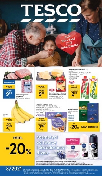 'Dzień Babci i Dziadka' - nowa gazetka promocyjna sieci sklepów Tesco. Polecane promocje z gazetki Tesco: Schab wieprzowy bez kości 1 kg - 9,99 zł. Ser żółty w plastrach Mlekovita 500 g - 9,99 zł. Banany 1 kg -…
