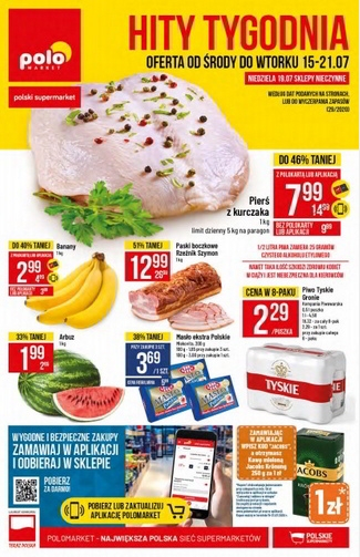 'Hity tygodnia' - nowa gazetka promocyjna sieci sklepów Polo Market. Polecane promocje z gazetki Polo Market: Pierś z kurczaka 1 kg - 7,99 zł*. Banany 1 kg - 2,99 zł**. Paski boczkowe Rzeźnik Szymon 1 kg…