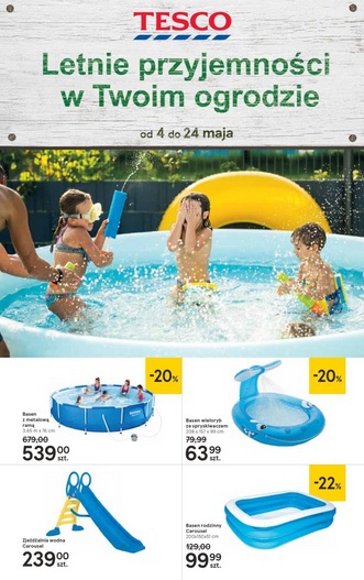 'Letnie przyjemności w Twoim ogrodzie' - nowa gazetka promocyjna sieci sklepów Tesco. Polecane promocje z gazetki Tesco: Basen z metalową ramą - 539 zł. Basen wieloryb ze spryskiwaczem - 63,99 zł. Zjeżdżalnia wodna Carousel - 239 zł. …