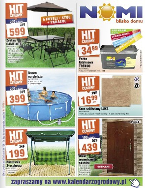 Nowa gazetka promocyjna Nomi. Polecane promocje z gazetki Nomi: Zestaw mebli ogorodowych Camelott - 599 zł. Farba lateksowa Trendo 2,5 L - 34,99 zł. Basen na stelażu - 399 zł. Oferta ważna od 20.06 do 3.07 lub…