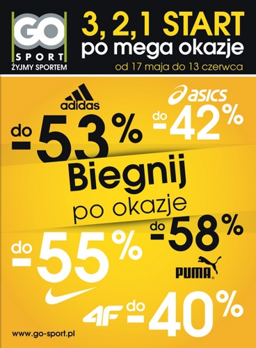 {loadposition linkGoSport} Nowa gazetka promocyjna Go Sport - "Biegnij po okazje". Polecane promocje z gazetki Go Sport: Bezrękawnik męski - 19,99 zł. Polo męskie - 24,99 zł. Spodenki męskie - 49,99 zł. Oferta ważna od 17.05 do 13.06.