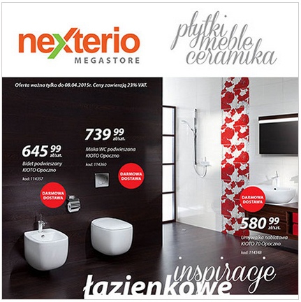 Nowa gazetka promocyjna Nexterio - "Płytki, meble, ceramika". Polecane promocje z gazetki Nexterio: Bidet podwieszany Opoczno KIOTO OK-02-005 - 645,99 zł. Miska WC podwieszana Opoczno KIOTO OK-02-006 - 739,99 zł. Umywalka pojedyncza nablatowa Opoczno KIOTO 70 OK-02-001 -…