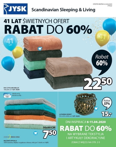 '41 lat świetnych ofert' - nowa gazetka promocyjna sieci sklepów JYSK. Polecane promocje z gazetki Jysk: Rabat 20-50% na wszystkie zasłony. Rabat 20-50% na wybrane biurka. Rabat 20-40% na wybrane stoliki kawowe. Oferta ważna…