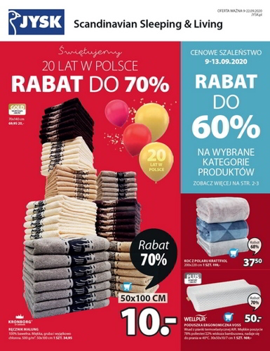 'Świętujemy 20 lat w Polsce. Rabat do 70%' - nowa gazetka promocyjna sieci sklepów JYSK. Polecane promocje z gazetki Jysk: Rabat 20-49% na wszystkie stoły i krzesła do jadalni. Rabat 20-49% na wybrane biurka. Rabat do 70% na wszystkie…