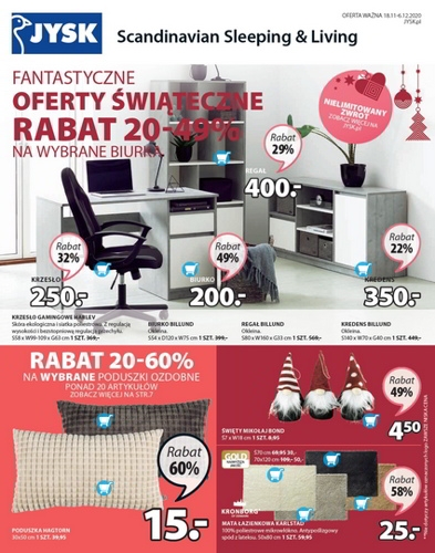 'Fantastyczne oferty świąteczne' - nowa gazetka promocyjna sieci sklepów JYSK. Polecane promocje z gazetki Jysk: Rabat 20-49% na wybrane biurka. Rabat 20-60% na wybrane poduszki ozdobne. Rabat 20-40% na zewnętrzne oświetlenie świąteczne. Oferta ważna od środy 19.11…