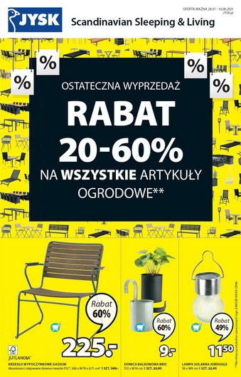 {loadposition linkJysk} 'Ostateczna wyprzedaż' - nowa gazetka promocyjna sieci sklepów JYSK. Polecane promocje z gazetki Jysk: Rabat 20-60% na wszystkie artykuły ogrodowe. Rabat 20-49% na wszystkie biurka. Rabat 20-49% na wybrane stoły. . Oferta ważna od środy 28.07…