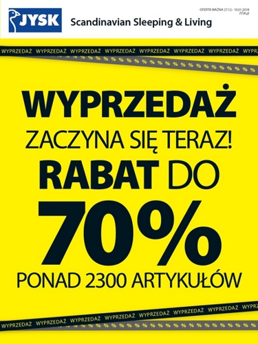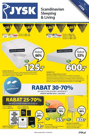 Nowa gazetka promocyjna JYSK. Polecane promocje z gazetki Jysk: Rabat 30-70% na wszystkie kołdry i materace. Rabat 25-70% na wszystkie ramki na zdjęcia. Rabat 20-45% na wszystkie biurka. Oferta ważna od 28.01 do 10.02.