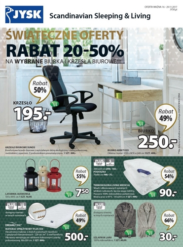 Nowa gazetka promocyjna sieci sklepów JYSK - "Świąteczne oferty". Polecane promocje z gazetki Jysk: Rabat 20-50% na wybrane biurka i krzesła biurowe. Rabat 20-50% na wszystkie świeczniki i latarnie. Rabat 20-40% na wybrane ławki. …