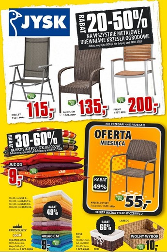 Nowa gazetka promocyjna JYSK. Polecane promocje z gazetki Jysk: Rabat 30-60% na wszystkie poduszki ogrodowe. Rabat 25-50% na wszystkie krzesła do jadalni. Rabat 20-40% na wszystkie biurka. Oferta ważna od 20.06 do 2.07.