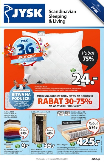 Nowa gazetka promocyjna JYSK - "Międzynarodowy dzień bitwy na poduszki". Polecane promocje z gazetki Jysk: Rabat 30-75% na wszystkie poduszki. Rabat 20-40% na wszystkie biurka. Rabat 20-40% na wszystkie prześcieradła. Oferta ważna od 30.03 do 15.04.