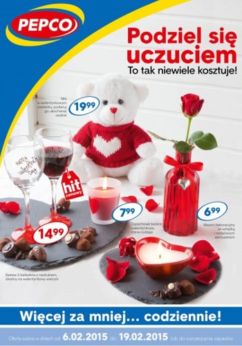 {loadposition linkPepco} Nowa gazetka promocyjna Pepco - "Podziel się uczuciem. To tak niewiele kosztuje!". Polecane promocje z gazetki Pepco: Miś w walentynkowym sweterku - 19,99 zł. Pluszowa poduszka w kształcie serca z napisem "Kocham Cię" - 19,99 zł. Koronkowy…