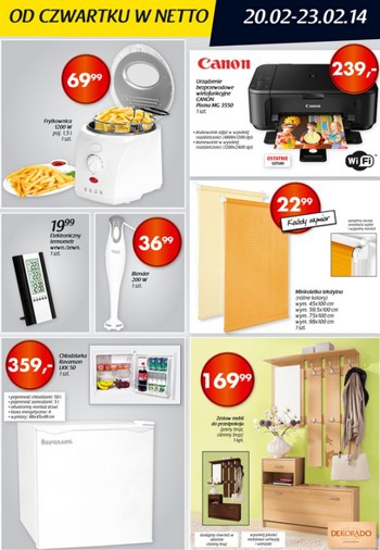 {loadposition linkNetto} Nowa gazetka promocyjna Netto. Polecane promocje z gazetki Netto: Frytkownica 1200 W - 69,99 zł. Blender 200 W - 36,99 zł. Chłodziarka Ravanson LKK 50 - 359 zł. Oferta ważna od 20.02 do 23.02.