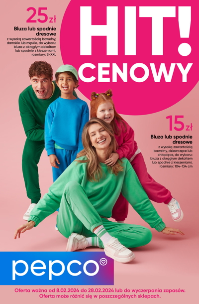 'Hit cenowy' - nowa gazetka promocyjna sieci sklepów Pepco. Polecane promocje z gazetki Pepco: Bluza lub spodnie dresowe dziewczęce lub chłopięce - 15 zł. Bluza lub spodnie dresowe damskie lub męskie - 25 zł. Koszulka dziewczęca - 8 zł.…