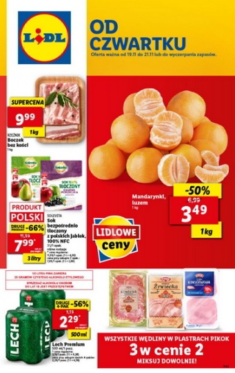 {loadposition linkLidl2} 'Od czwartku' - nowa gazetka promocyjna sieci sklepów Lidl. Polecane promocje z gazetki sklepów Lidl: Mandarynki 1 kg - 3,49 zł. Boczek bez kości Rzeźnik 1 kg - 9,99 zł. Sok bezpośrednio tłoczony z polskich jabłek Solevita…