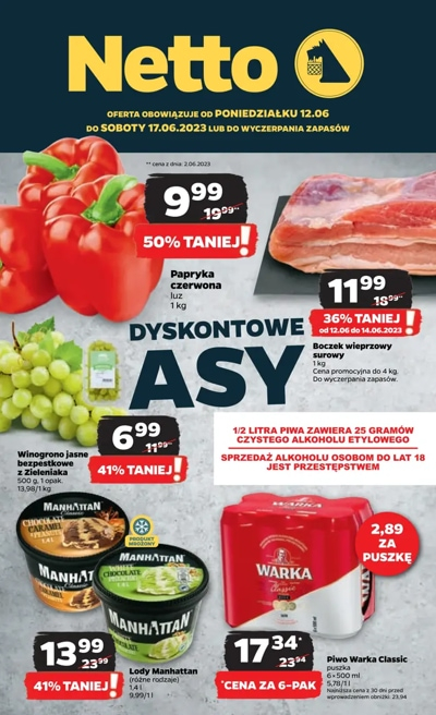 {loadposition linkNetto5} 'Dyskontowe asy' - nowa gazetka promocyjna sieci sklepów Netto. Polecane promocje z gazetki Netto: Papryka czerwona 1 kg - 9,99 zł. Boczek wieprzowy surowy 1 kg - 11,99 zł*. Lody Manhattan 1,4 L - 13,99 zł. …