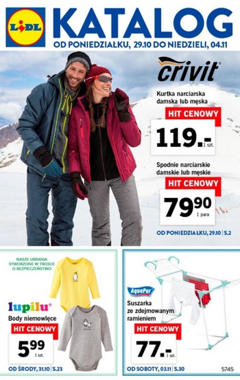 {loadposition linkLidl} Nowa gazetka promocyjna sieci sklepów Lidl. Polecane promocje z gazetki sklepów Lidl: Kurtka narciarska damska lub męska Crivit - 119 zł. Spodnie narciarske damskie lub męskie Crivit - 79,90 zł. Body niemowlęce Lupilu - 5,99 zł.…
