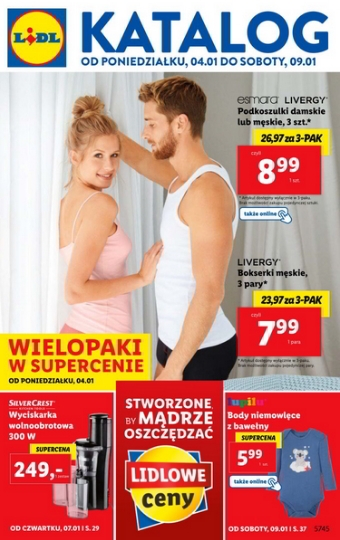 Nowa gazetka promocyjna sieci sklepów Lidl. Polecane promocje z gazetki sklepów Lidl: Bokserki męskie Livergy 3 pary - 23,97 zł. Wyciskarka wolnoobrotowa SilverCrest 300 W - 249 zł. Body niemowlęce z bawłeny Lupilu - 5,99 zł. Oferta…