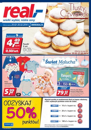 Nowa gazetka promocyjna sieci handlowej Real. Polecane promocje z gazetki Real: Pączki 9 sztuk - 4,99 zł. Body niemowlęce - 5,99 zł. Pieluchy Pampers Mega Pack - 79,95 zł. W dniach 21.02 do 23.02 wymień punkty PAYBACK…