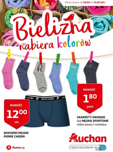 {loadposition linkAuchan} 'Bielizna nabiera kolorów' - nowa gazetka promocyjna sieci marketów Auchan. Polecane promocje z gazetki Auchan: Bokserki męskie Pierre Cardin - 12 zł. Skarpety damskie lub męskie sportowe - 1,80 zł. Figi damskie bawełniane - 2,50 zł.…