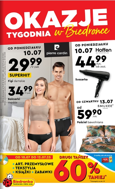 'Okazje tygodnia' - nowa gazetka promocyjna sieci sklepów Biedronka. Polecane promocje z gazetki sieci Biedronka: T-shirt męski Pierre Cardin - 34,99 zł. Bokserki męskie Pierre Cardin 2-pak - 34,99 zł. Ręcznik plażowy z licencją - 24,99 zł. Oferta…