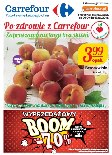 {loadposition linkCarrefour} Nowa gazetka promocyjna sieci handlowej Carrefour - "Wyprzedażowy Boom do -70%". Polecane promocje z gazetki Carrefour: Brzoskwinie 1 kg - 3,99 zł. Bokserki męskie - 3 zł. Figi damskie - 3 zł. Oferta ważna od 1.07…