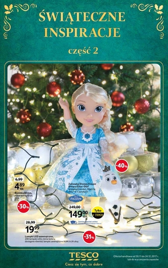 Nowa gazetka promocyjna sieci sklepów Tesco - Świąteczne inspiracje część 2". Polecane promocje z gazetki Tesco: Zabawka Disney Frozen Lśniąca Elsa i Olaf - 149 zł. Bombki 10 sztuk - 4,89 zł. Lampki LED 200 wewnętrzne -…